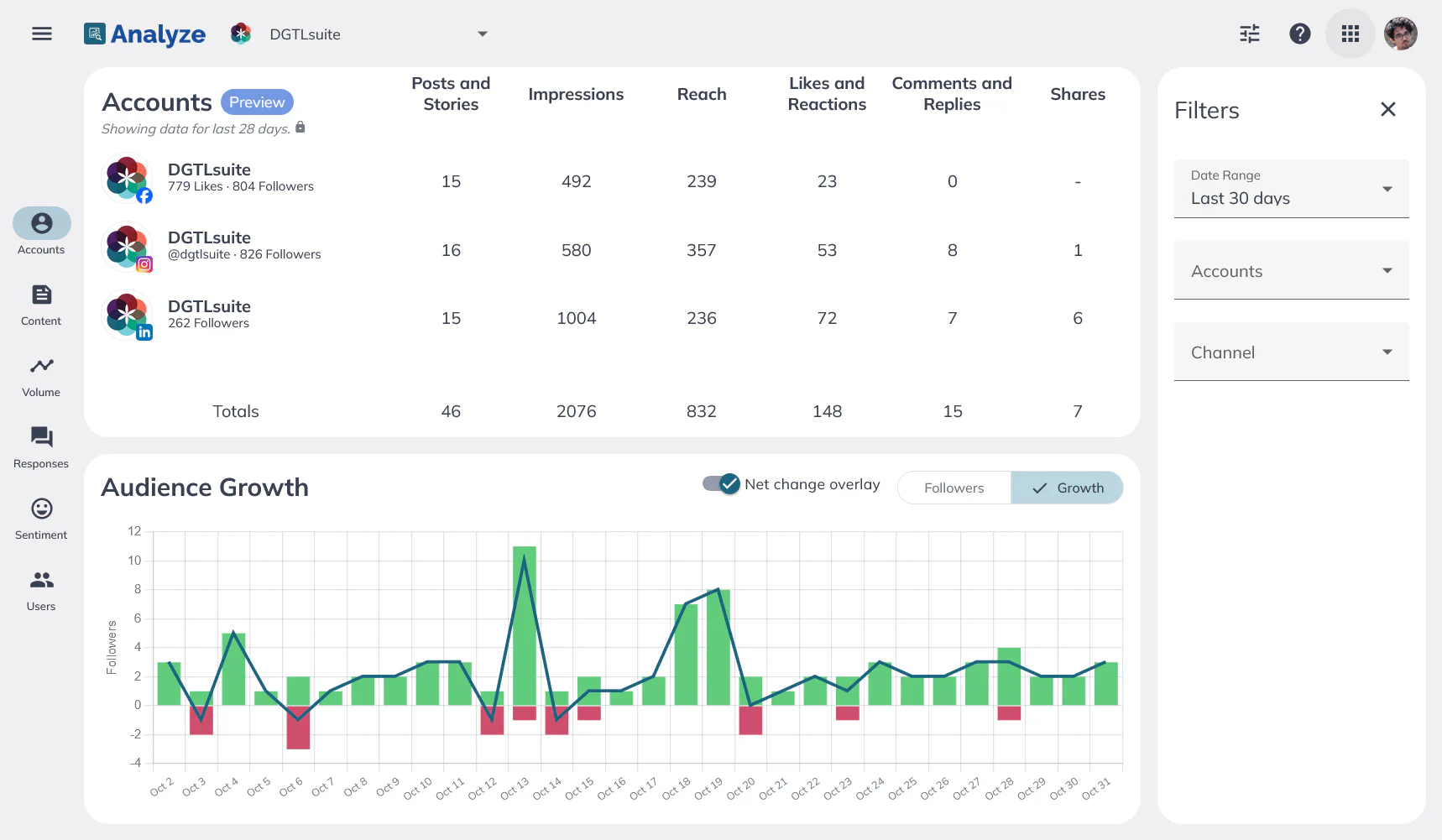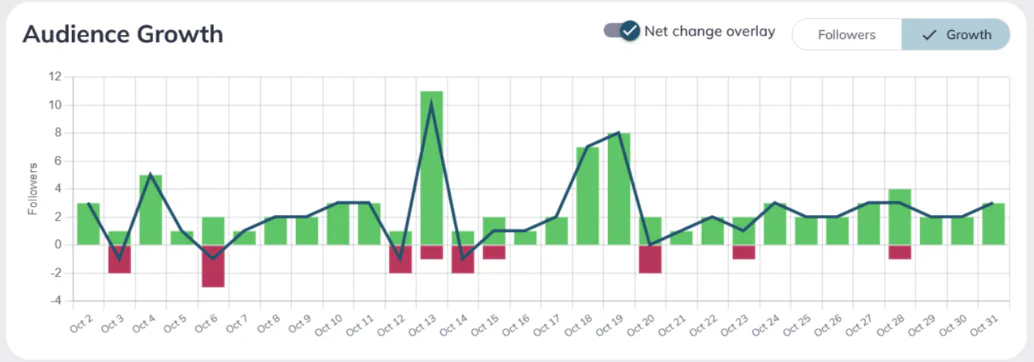 The chart can be customized to show either growth (with red and green bars) or total follower count, and includes an optional “Net Change” overlay line for a clear view of your overall audience movement. The chart is highly customizable with a filter panel on the right, allowing you to adjust the date range, select specific channels, and focus on particular pages or profiles. This provides a flexible way to monitor and analyze your audience growth trends.