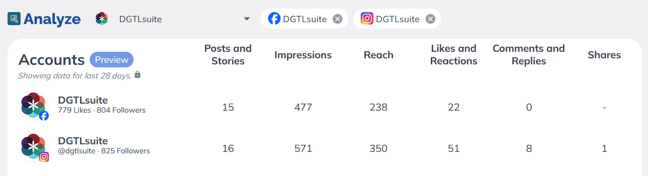 This chart displays important data such as the number of posts/stories published, impressions, reach, likes/reactions, comments/replies, and shares over the past 28 days. Each column is labeled with tooltips to clearly explain how the metrics are calculated, ensuring easy interpretation. You can also sort the data in ascending or descending order to better analyze trends and performance across your accounts. Note that due to platform restrictions, only the past 28 days of data are available in this chart.