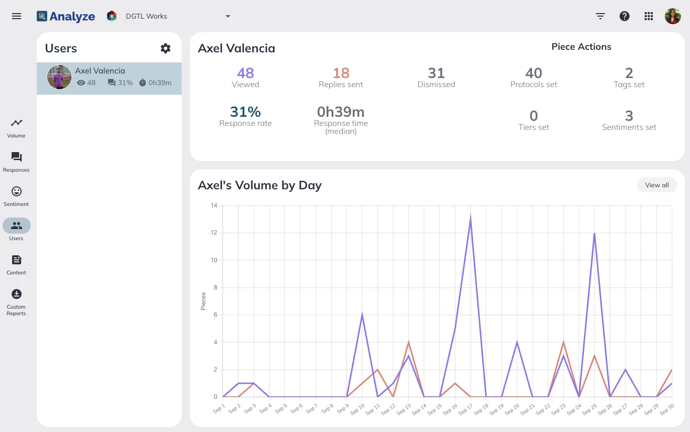 The Users Page in DGTL Analyze offers an in-depth look at individual user activity within your team’s inbox (DGTL Engage). Here, you can track key metrics such as the number of conversations viewed, messages replied to, and the user’s overall response rate and median response time. Additionally, you’ll see how many conversations they dismissed and the specific actions they’ve taken, including protocols set, tiers assigned, and tags added to messages.