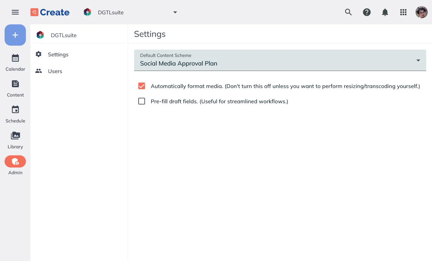The Admin page in Create is your go-to place for configuring workflow-specific settings. Whether you’re managing multiple brands or streamlining how your team creates content, this page gives you control over how drafts are created and how media is processed.