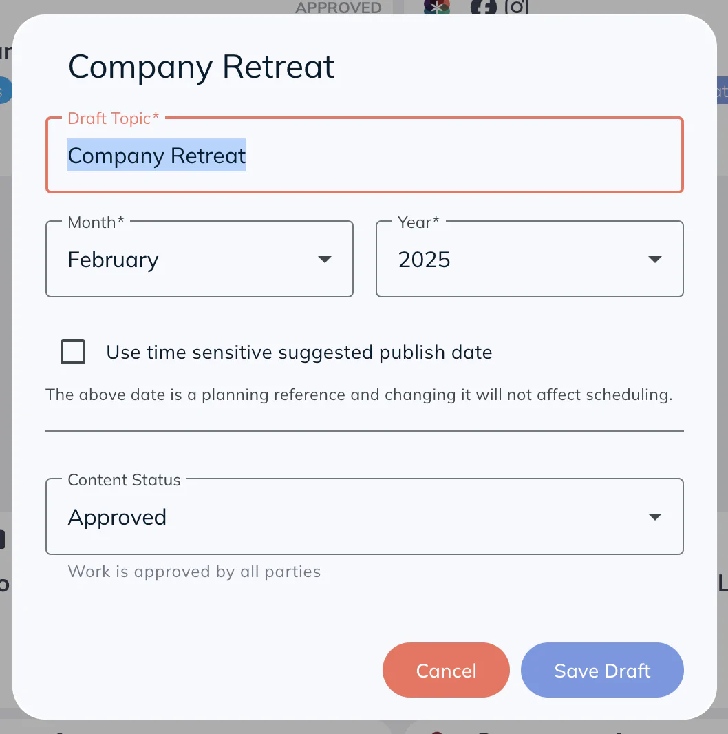 - Make Your Changes: A popup will appear where you can update key information like the draft name, status, suggested publish date, and suggested publish time.