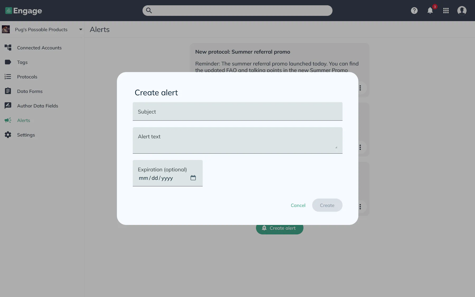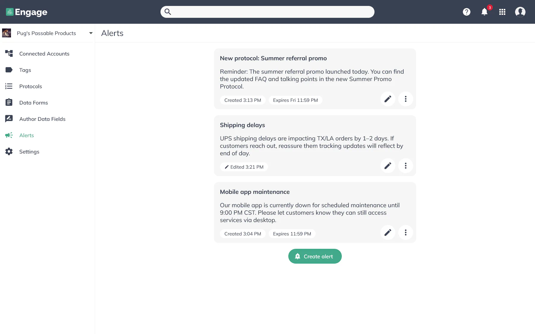 Team Alerts are internal notifications you can create to help your team stay informed about timely updates, issues, or important context when responding to messages in the Engage Inbox. These alerts ensure your agents always have the latest information at their fingertips.